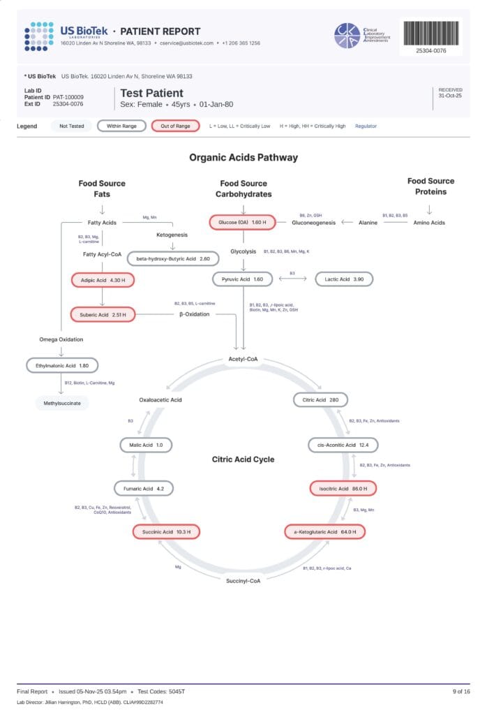 Vår profil for organiske syrer måler effektivt 62 organiske syrer, og gir en unik biokjemisk profil for hver pasient. Denne viktige testen vurderer næringsopptak og utnyttelse, og hjelper med å identifisere vitaminmangel og ubalanser som kan bidra til helseproblemer som tretthet, humørsvingninger og fordøyelsesproblemer.
